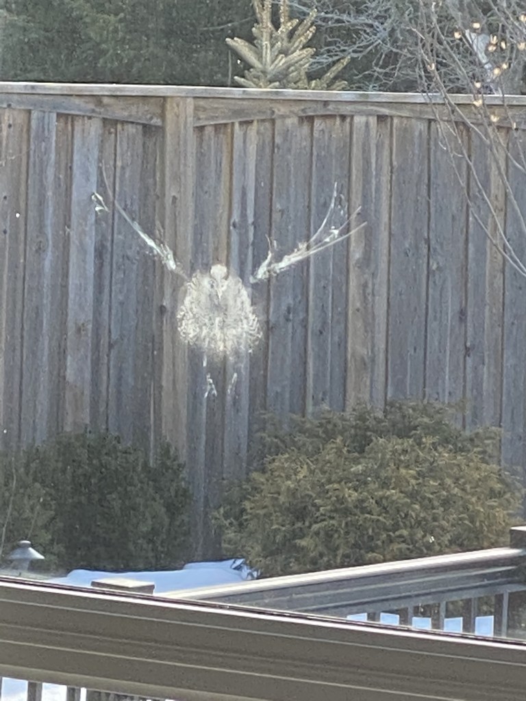 As though fossilized somehow, that freaking dead bird had left a near-perfect impression of itself splat against our window. There it was, like a ghost bird, with its eyes, beak, and little legs in a perfect, distinct form, glittering in the sunlight, while the REAL bird was -I assure you- very much dead on my deck.